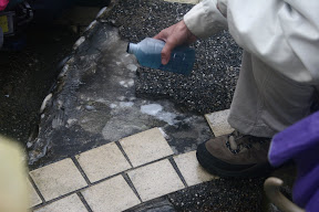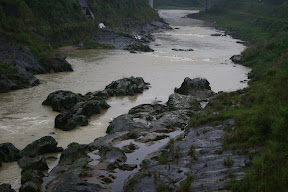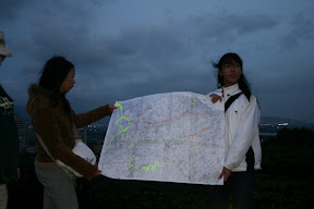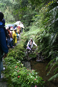 在姑娘廟的河流向是往西流,流經姑娘廟的是景美溪的上游大溪墘溪,老師是讓我們對這流向有一些印象,等一回兒就會對基隆河的源頭的流向作比對. 我們從山中的建物看出這些都蓋在河階上是.(河階是山中峽谷中的平台)老師也特別的說明人類為了生活的需求把河道縮小,用來擴大馬路及建地,待雨季來時大自然的反撲就會把人類搶奪的土地要回來.其威力是人類難以想像的.如圖中河道中水泥擋扳就是被水中夾帶的石頭或垃圾撞了一個破洞,沒破的地方也有許多明顯的痕跡.