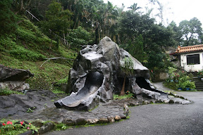 我們一路走小路往基隆河的源頭走去,路上還看到一群台灣藍鵲共有7-8隻,沿路看到一個涼亭和一個房子,老師告訴我們這個房子我們有生之年可以看到會被基隆河源頭侵蝕.經過一個佛寺,繞過側所後方看到一條小逕,小逕旁的小水溝就是基隆的上游,之前老師說他可以一腳跨過基隆河.我們現在才恍然大悟.我們接著往上步行數分鐘來到一個平台,在平台右側有一個大石頭及石洞,石洞內,有兩個似觀音的石 像.老師告訴我們根據他的推論該平台以前曾是偃塞湖.