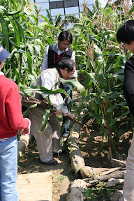 餐後我帶著小朋友看餐廳後的果園及菜園。那有香蕉、玉米、南瓜等植物,我帶著小朋友穿梭在果園近距離的觀察植物,張老師也過來了,突然間聽到老師一陣騷動好像是撿到黃金似的,原來老師發現了一個雙胞胎的玉米,老師說他觀察生態這麼久第一次看到這種雙胞胎的玉米,取得菜園主人的同意我們將這個稀世珍寶帶回車上,往下一個據點出發了。